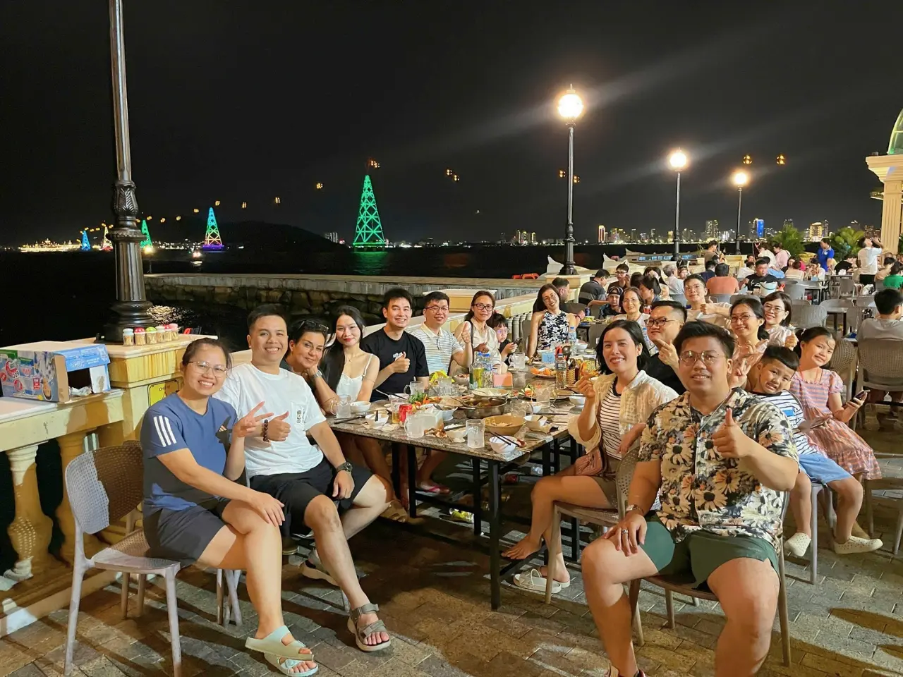 Một bữa tiệc ấm cúng được New Life Travel sắp xếp tại vị trí đắc địa, nơi gia đình vừa thưởng thức ẩm thực tươi ngon, vừa ngắm nhìn ánh đèn rực rỡ từ những trụ cáp treo hình tháp Eiffel phía xa.