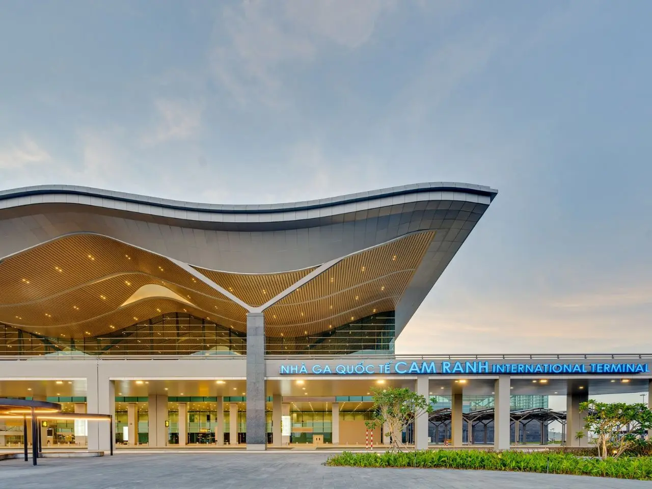 - Nhà ga quốc tế T2: Với diện tích 50.500 m², được thiết kế theo cảm hứng từ tổ chim yến – loài chim đặc trưng của Khánh Hòa. Kiến trúc mái lượn sóng kết hợp điểm nhấn lấy sáng ở đỉnh mái, tạo nên một công trình độc đáo và lung linh khi về đêm.