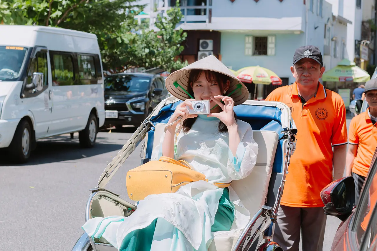 Du khách chụp ảnh với trang phục áo dài truyền thống Việt Nam và trải nghiệm tour xích lô Nha Trang khám phá di sản văn hóa địa phương